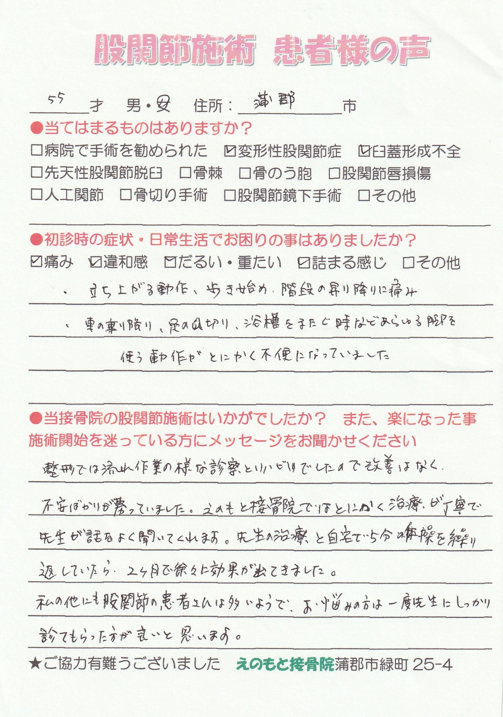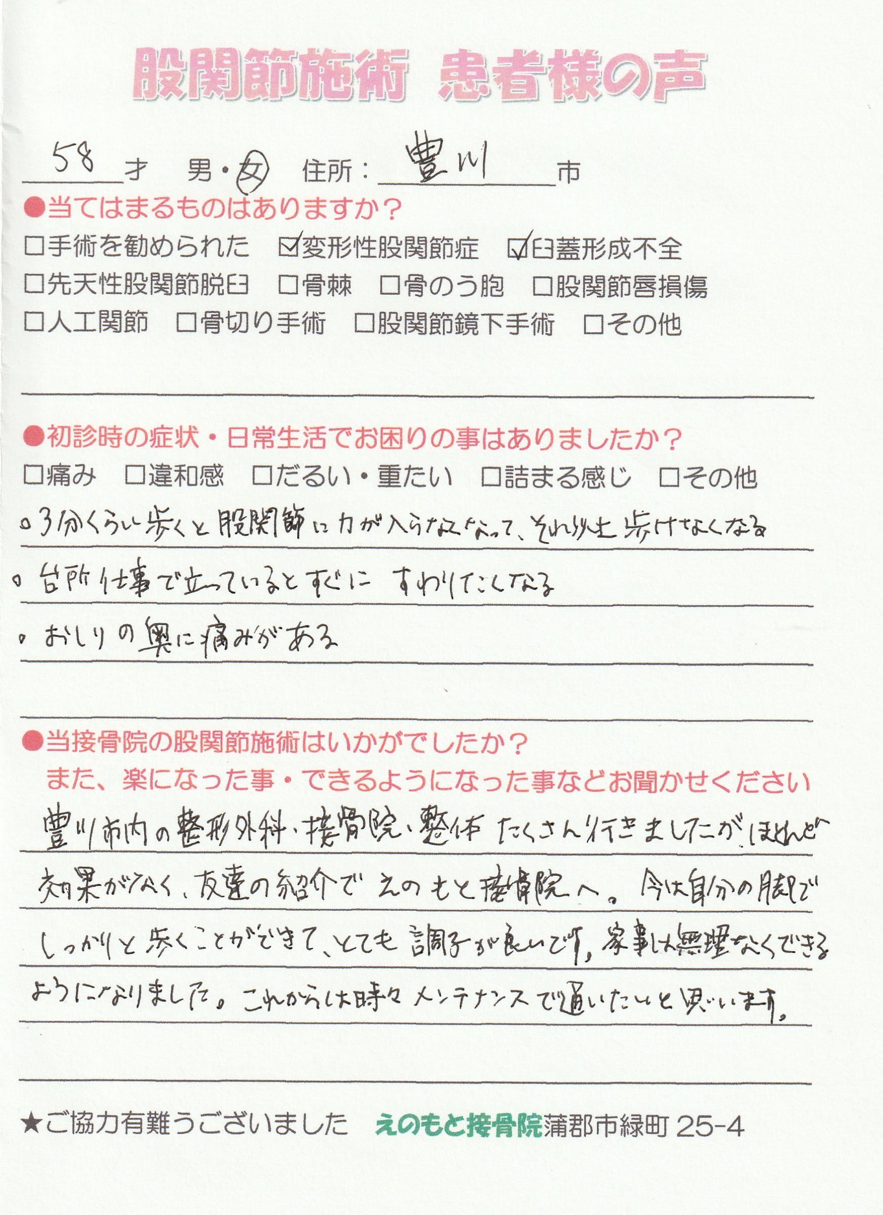 ●当接骨院の股関節施術はいかがでしたか? また、楽になった事 施術開始を迷っている方にメッセージをお聞かせください