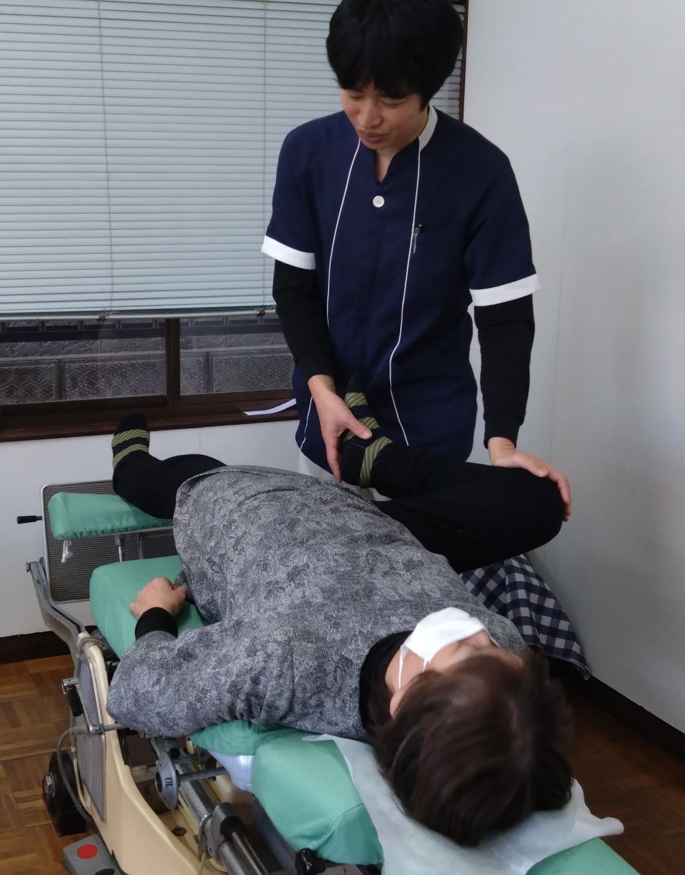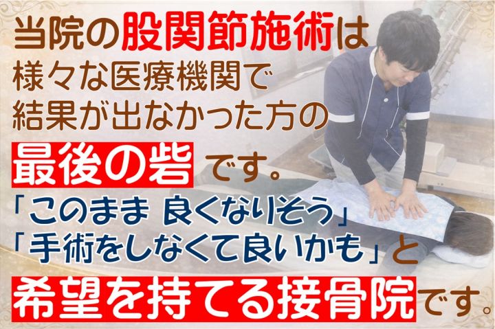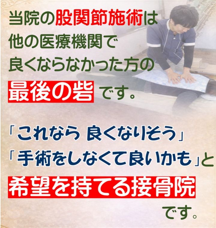 当接骨院の施術内容:①マッサージ→硬くなっている骨盤まわり・太ももの筋肉をほぐしていきます。疼痛を抱えている場合、原因は股関節内ではなく筋肉が原因となっていることがほとんどです。そのため脚の開く範囲が狭くなっていたり、骨盤の関節の柔軟性が低下しています②ストレッチ→股関節の可動域を広げ、柔軟性を高めます。③矯正→患者様によっては左右の脚の長さが違っています。よって、歩行時に痛みが出たりします。足の長さを正すことによって、正常な歩行に近づけていきます。④自宅でのエクササイズ・ストレッチ・トレーニングの提案→自宅でできるとても簡単なエクササイズ:過度な負荷を与えず、無理なく続けられます。太もも・お尻の筋力を日常生活を送るうえで最低限必要な筋肉を鍛えていくエクササイズです。ストレッチ→足の開きの拡大・可動域を広げることを目的とします。硬くなった股関節を柔らかくしていくストレッチです。トレーニング:日常生活で必要な筋肉の持久力を付けていきます。エクササイズ・ストレッチ・トレーニング全て行っても3分程度で終了しますので、どなたでも無理なく続けることができます。患者様それぞれに合った完全オーダーメイドのストレッチです。